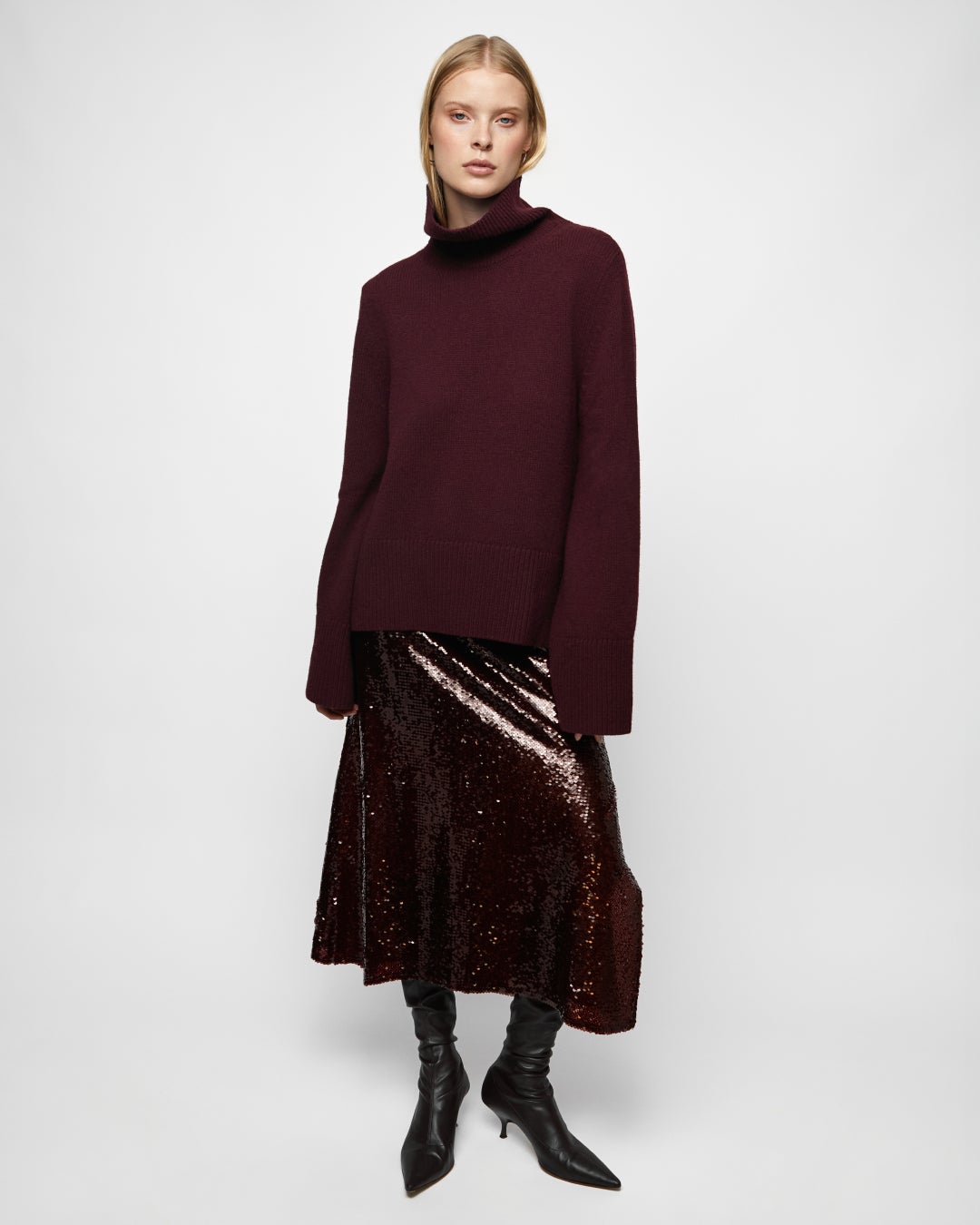 The collection’s color palette combines sophisticated deep reds and burgundy with neutral tones like camel and grey, ensuring each piece integrates effortlessly into any wardrobe. The use of luxurious materials such as cashmere, wool, lace, sequins, and satin enhances the tactile appeal and elevates each garment.